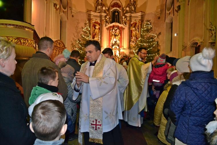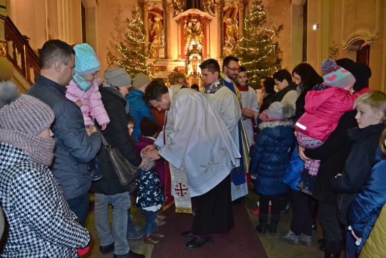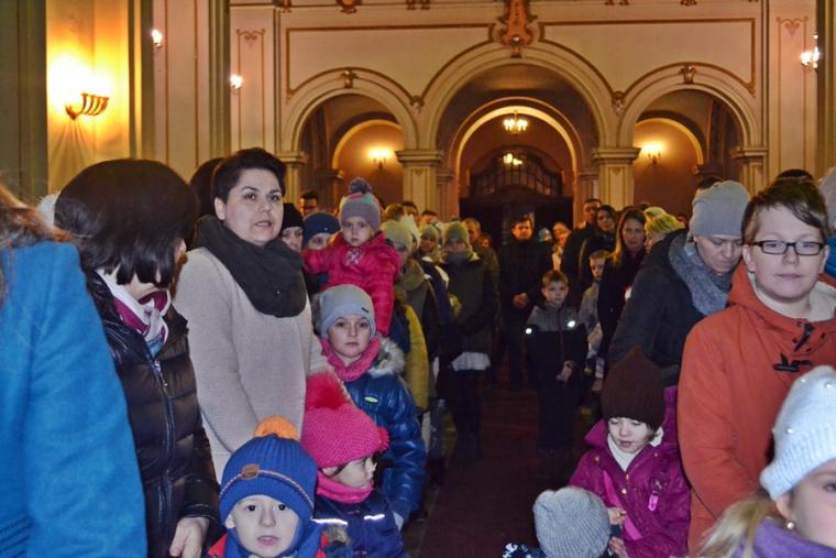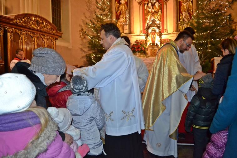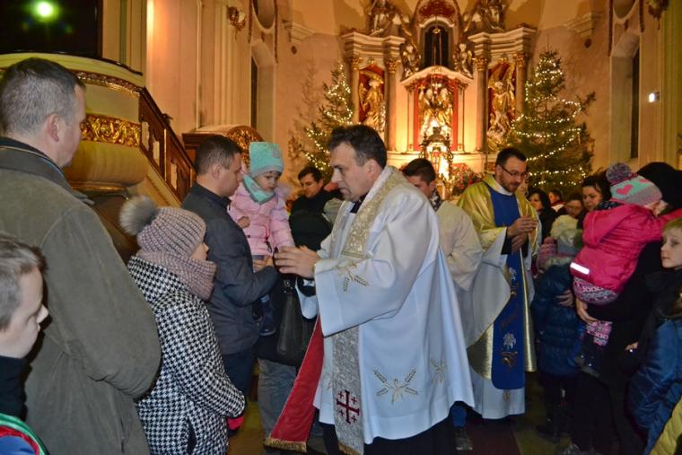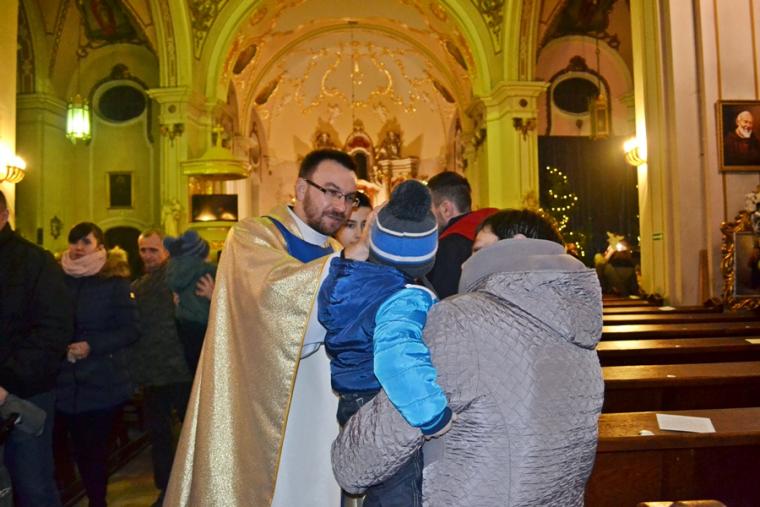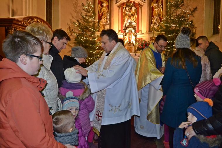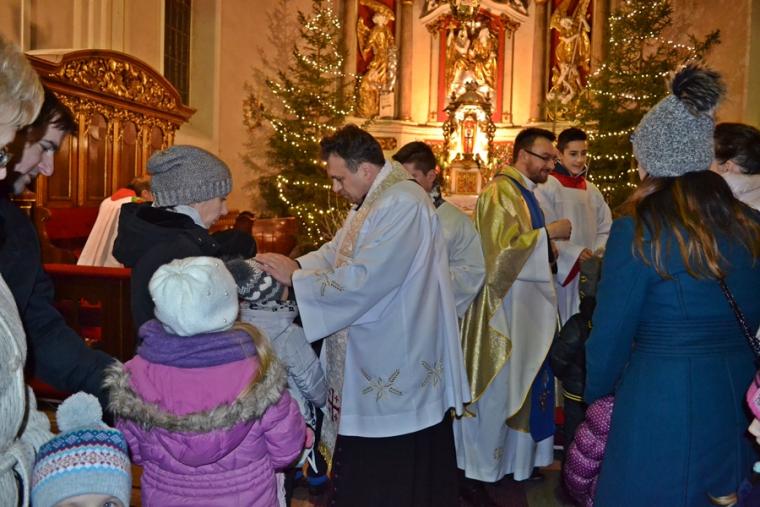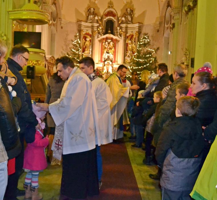 Jest już tradycją w mikstackiej wspólnocie parafialnej, że u progu Nowego Roku sprawowana jest Msza Święta w intencji dzieci z naszej parafii połączone z indywidualnym błogosławieństwem dla nich. Radością duszpasterzy parafii byli licznie zgromadzeni na Mszy św. o godz. 16:00 rodzice wraz ze swoimi dziećmi. "Pozwólcie dzieciom przychodzić do mnie, nie zabraniajcie im, bo do takich należy królestwo Boże” (Mk 10, 14-15) powiedział Jezus do uczniów, którzy chcieli, by odpoczął nieco i starali się nie dopuszczać do niego dzieci. Mszę Świętą o błogosławieństwo Boże dla dzieci sprawował ks. wikariusz Krzysztof Lipiński. Homilię w czasie tej Mszy Świętej wygłosił ks. proboszcz Krzysztof Ordziniak. Zwrócił w niej uwagę na problem pokoju w różnych wymiarach. Podkreślił, że u progu Nowego Roku nie wiemy co on nam przyniesie, to wie tylko Bóg, który jest dawcą pokoju. Pokój jest największym pragnienie każdego człowiek. W homilii ks. kan. Krzysztof powiedział: „ Jeżeli będziemy się starali, aby w naszych sercach był Bóg, wtedy będziemy ludźmi prawdziwego , gdy zaś w naszych sercach będzie zło, to będziemy ludźmi wojny i niepokoju. Z serca ludzkiego bowiem pokój promieniuje i rozszerza się na dom, rodzinę, szkołę, zakład pracy, wieś, miasto i cały naród”. Tego pokoju w rodzinach, w ludzkich sercach potrzebują do wzrastania w łasce u Boga i ludzi, dzieci które zostały przyprowadzone, przyniesione przez swoich rodziców. Ponadto kaznodzieja przywołał cztery rady Tomasza a Kempis zawarte w książce „ O naśladowaniu Chrystusa” które mają pomóc człowiekowi w osiągnięciu prawdziwego pokoju: Staraj się raczej spełniać czyjąś wolę niż własną; Chciej zawsze raczej mniej niż więcej; Szukaj zawsze miejsca ostatniego i ustępuj wszystkim; Chciej zawsze i módl się o to , aby całkowicie wypełniała się w Tobie wola Boża”. Kończąc homilie ks. kan. życzył wszystko w 2017 rok pokoju, który wypływa z czystego sumienia i współpracy z łaską Bożą. Po Mszy Świętej przewodniczący Eucharystii ks. wikariusz Krzysztof odmówił modlitwę błogosławieństwa dzieci. Dzieci wraz z rodzicami stały w tym czasie w szpalerze. Następnie ks. proboszcz i ks. wikariusz udzielali dzieciom indywidualnego błogosławieństwa. Każde dziecko otrzymało naklejkę przedstawiającą Świętą Rodzinę z Nazaretu. Cieszył oczy ciągnący się od balasek aż po chór szpaler rodziców ze swoimi dziećmi. Zaprosili Świętą Rodzinę, by otoczyła opieką ich rodziny, a dzieci z Bożym błogosławieństwem rozpoczęły 2017 rok. Pod taką opieką z pewnością będą wzrastały w wierze, mądrości, w łasce u Boga i ludzi, stając się radością dla swoich rodzin, ale także wspólnoty parafialnej. Wiele rodzin po zakończeniu błogosławieństwa zatrzymała się przy mikstackim Betlejem. Rodzicom dziękujemy z piękne świadectwo wiary i zaufania Bogu.