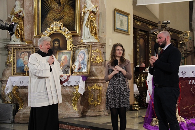 Temat marcowego spotkania brzmiał: „Święty Józefie prosimy: bądź patronem wielkopostnej odnowy życia małżeństw i rodzin, wyproś nam ducha przebłagania za grzechy przeciwko życiu”. Przybyłych na spotkanie pielgrzymów z całej Polski przywitał ks. prał. Jacek Plota, który wskazywał, że miesiąc marzec w sposób szczególny poświęcony jest św. Józefowi. - Po raz kolejny staje przed nami św. Józef, wielki obrońca życia, małżonek Maryi i Opiekun Syna Bożego. Pokorny, milczący Święty, który mówi do nas również i dziś swoimi czynami, bo cuda przez Jego wstawiennictwo dokonują się także teraz w XXI wieku, co zostało udokumentowane w nowo wydanej książce „Cuda Świętego Józefa”. Św. Józef świadek wiary uczy nas cichej i ofiarnej służby rodzinie i życiu, służby mającej swoje źródło i moc w Bogu – powiedział kustosz kaliskiej bazyliki. Modlitwę wstawienniczą w intencji rodzin i obrony życia człowieka przed obrazem św. Józefa Kaliskiego prowadził ks. Piotr Machała. Konferencję pt. „Małżeństwo – wspólna droga do świętości” wygłosili Karolina i Maciej Piech, małżonkowie którzy poznali się w drodze do Kalisza na spotkanie w Sanktuarium św. Józefa, absolwenci Wyższej Szkoły Kultury Społecznej i Medialnej w Toruniu, prowadzą działalność ewangelizacyjną w internecie ukazując piękno powołania małżeńskiego, są ambasadorami akcji Zdrapka Wielkopostna. Małżonkowie opowiadali, jak ważną rolę w ich życiu odgrywa wiara w Boga. Wskazywali, że swoimi doświadczeniami dzielą się na prowadzonym blogu. Rozmowę z gośćmi prowadził ks. prał. Leszek Szkopek.