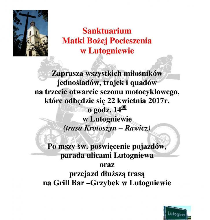 Wokół nas rozkwita przyroda. Cieszy oczy zieleń drzew i kolorowe kwiaty. Wszystko to zachęca, by wyruszyć doświadczać piękna świata stworzonego przez Boga. Można wyruszyć na piesze wędrówki, ale można także mniejszymi, czy większymi pojazdami jednośladowymi. Warto, by miłośnicy motocykli uczynili to z Bożym błogosławieństwem. W związku z tym, już po raz trzeci Kustosz Sanktuarium Matki Bożej Pocieszenia w Lutogniewie zaprasza 22 kwietnia na godz. 14:00 wszystkich miłośników jednośladów: rowerów, motorów, trajek i quadów na Msze Świętą z okazji otwarcia sezonu motocyklowego. Po Mszy Świętej poświęcenie wszystkich jednośladów parada ulicami Lutogniewa. Będzie i czas na wspólne spotkanie. A potem z Bożym błogosławieństwem, pod opieką Matki Bożej Pocieszenia, w duchu odpowiedzialności za najcenniejszy dar, życie, swoje i innych użytkowników dróg można wyruszyć na szlak…