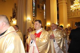 W homilii biskup kaliski zachęcał duchownych do odkrywania na nowo swojego kapłaństwa. – W roku jubileuszowym 25-lecia istnienia diecezji kaliskiej staramy się na nowo odkryć tożsamość kapłańską, aby jeszcze gorliwej pracować w winnicy Pańskiej. Wewnętrzna formacja kapłańska z natury rzeczy nastawiona jest na ciągły rozwój i wzrost – mówił celebrans. Podkreślał, że kapłani poprzez Słowo Boże, sakramenty święte i ewangelizację budują Kościół święty, który jest komunią, a nie organizacją użyteczności publicznej. – Niestety, wielu publicystów wypowiadających się na łamach prasy na temat Kościoła, chciałoby go sprowadzić tylko do jakiejś organizacji charytatywnej lub filantropijnej – powiedział kaznodzieja. Dodał, że akcja charytatywna to tylko jeden z aspektów działalności Kościoła, ważny, ale nie najważniejszy. – Zadaniem Kościoła jest misja zbawienia człowieka i w tę misję musi być wpisane nasze kapłaństwo – stwierdził bp Janiak. Zaznaczył, że współczesny świat jest dotknięty laicyzmem, który eliminuje z życia człowieka obecność Boga, wartości nadprzyrodzone i moralne kryteria oceny postępowania ludzi. – Z drugiej strony mamy do czynienia z fundamentalizmem religijnym, który prześladuje i morduje w imię religii, w imię Boga, co jest niezgodne z elementarnym poczuciem zdrowej religijności. W tę optykę współczesnej cywilizacji i globalizacji wrzucony jest kapłan, aby mimo wszystkich przeszkód głosił Dobrą Nowinę o zbawieniu – wskazywał hierarcha. Prosił wiernych o modlitwę w intencji księży. – Zwracam się do Was, drodzy wierni, abyście swoją modlitwą wspierali swoich duszpasterzy. Przez dobrą i harmonijną współpracę można dokonać wiele szlachetnych dzieł w parafiach, do których należycie. Niech Wasza dyspozycyjność będzie zachętą dla kapłanów, by jeszcze gorliwiej pracowali dla zbawienia dusz – mówił ordynariusz kaliski. Podziękował księżom za posługę w diecezji kaliskiej. – Chciałbym Wam serdecznie podziękować za Waszą pracę dla dobra Kościoła Kaliskiego. Ten Kościół jest Waszą matką, a matkę trzeba kochać i wiernie jej służyć – powiedział bp Janiak. W czasie uroczystej liturgii biskup kaliski poświęcił krzyżmo oraz oleje chorych i katechumenów.