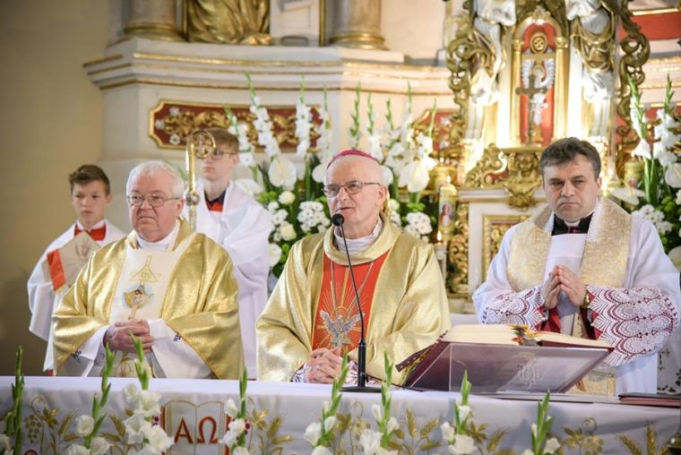 W czasie sumy 53 młodych parafian mikstackich z rąk Ks. Biskupa przyjęło Sakrament Bierzmowania, a wraz z nim Dary Ducha Świętego, które mają pomagać im w mężnym wyznawaniu wiary, w dawaniu świadectwa o Chrystusie w codziennym życiu. W tym dniu przeżywały także zakończenie „Białego Tygodnia” dzieci, które w Uroczystość Zesłania Ducha Świętego po raz pierwszy przyjęły Pana Jezusa do swego serca. Na początku Mszy Świętej ks. kan. Krzysztof Ordziniak, proboszcz mikstackiej parafii poprosił ks. bpa o przewodniczenie uroczystej sumie odpustowej oraz o udzielenie Sakramentu Bierzmowania młodzieży. Przed homilią ks. bp poświęcił krzyże, które mają młodym przypominać o przyjętym sakramencie dojrzałości chrześcijańskiej. W homilii ks. bp Teofil Wilski pochylił się nad tajemnicą Trójcy Świętej. Rozpoczynając homilię powiedział: „Trójca Święta to wielka tajemnica naszej wiary. Bóg jest jeden w Trzech Osobach. Ta prawda jest niezgłębiona, bo Bóg jest niezgłębiony. Skoro człowiek jest ograniczony, stworzony nie może przeniknąć do końca nieskończoności Boga”. Jednak jak podkreślił kaznodzieja, sam Bóg już w Starym Testamencie powiedział nam coś ważnego o sobie, co ważne jest także dla naszego życia. Szczególnie ważna i cenna dla zebranych w mikstacki wieczerniku była ta część homilii, która zawierała wskazania odnoszące się do codziennego życia. Ks. biskup wskazał, że mimo, iż Trójca Święta jest tajemnicą „ Bóg chce nam jednak odsłonić rąbka tego swego wewnętrznego życia, a także przez to powiedzieć coś ważnego o sobie samym, o nas samych”. Ks. Bp zaznaczył, że Ojciec posyła na świat swego Syna, Jezus objawia Ojca, ale także Jego miłość i miłosierdzie. Kaznodzieja wskazał na nieustanne poddawanie się i pełnienie woli Bożej przez Jezusa. Ks. Bp wskazując na znaczenie Ducha Świętego w życiu Syna Bożego powiedział: „W swoim człowieczeństwie naznaczony jest od początku Duchem Świętym. Ten Duch jest Jego mocą, Jego miłością”. Bóg, jak podkreślił ks. bp powiedział nam dużo o swoim wewnętrznym życiu. Podkreślił, że ponieważ człowiek stworzony został na obraz i podobieństwo Boże, jeśli w życiu naśladuje Boga, osiąga godność i cel, do którego został stworzony. Ks. bp podkreślił, że Jezus wypełniając swoje posłannictwo oddał za nas swoje życie. Powinno to stanowić dla nas zachętę do tego byśmy nie bali się ofiarować swego życia Bogu i innym. W dalszej części rozważania ks. bp wskazał przykłady Świętych, którzy oddali swoje życie w służbie Bogu i bliźnim. Powiedział: „Ten, który daje, ofiarnie służy innym ten jest wielki w swoim człowieczeństwie w świetle Bożych dróg”. Biskup Senior wskazał młodym pola działania, które pomogą im stać się ludźmi wielkimi, na których mogą realizować się służąc Bogu i bliźnim. Zwrócił uwagę na zagrożenia jakie niesie współczesny świat zapominający o Bogu, przykazaniach, prawdzie. Kolejna część homilii została poświęcona darom Ducha Świętego. Ks. bp wyjaśnił znaczenie poszczególnych darów w życiu człowieka. Kończąc kaznodzieja nawiązując do przeżywanego przez ks. kan. Zbigniewa jubileuszu podkreślił znaczenie posługi kapłańskiej, zachęcając jednocześnie młodych do refleksji nad swoim powołaniem. Po homilii miało miejsce wyznanie wiary. Młodzi odpowiadali na pytania ks. bpa o wiarę, były to te same pytania, na które przed laty odpowiedzieli za nich rodzice. Następnie ks. bp wraz z kapłanami w geście wyciągniętych rąk modli się o dary Ducha Świętego dla przyjmujących Sakrament Bierzmowania. Po zakończonej modlitwie miało miejsce namaszczenie czoła olejem Krzyżma Świętego, któremu towarzyszą słowa formuły sakramentalnej: „Przyjmij znamię daru Ducha Świętego”.