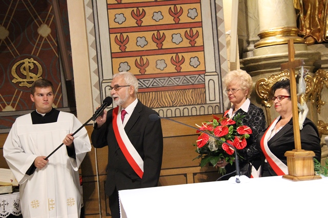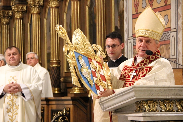 Biskup kaliski na ręce ks. prał. Adama Modlińskiego przekazał herb diecezji kaliskiej dla katedry.