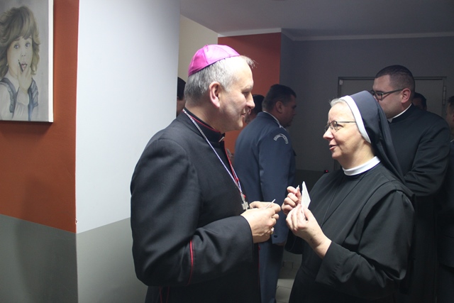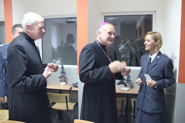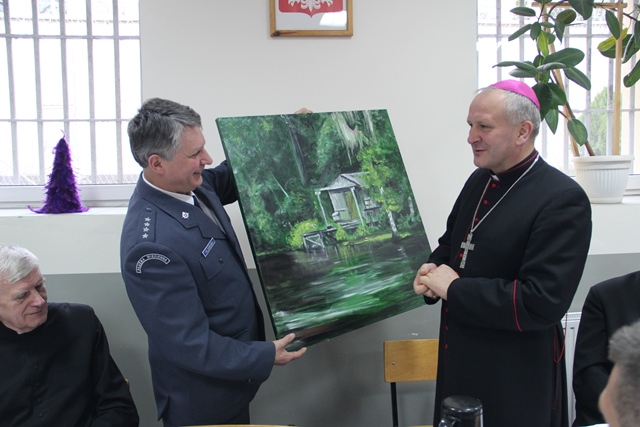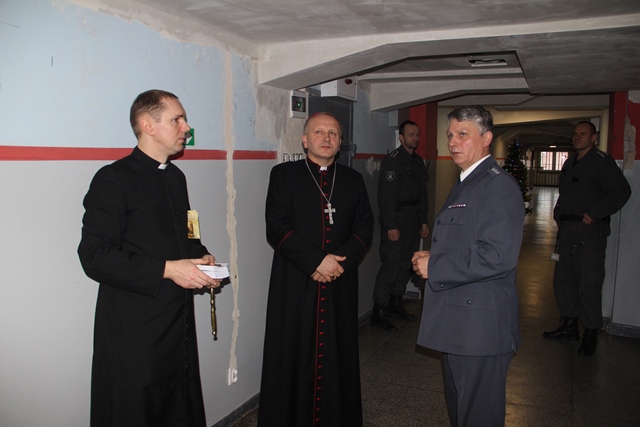 Wizytę w Areszcie Śledczym rozpoczęło spotkanie z pracownikami. Gości powitał dyrektor kpt. Waldemar Zaremba. Po odczytaniu Ewangelii o Bożym Narodzeniu przez ks. kan. Krzysztofa Nojmana, proboszcza konkatedry, słowo do pracowników aresztu skierował bp Łukasz Buzun, który przypomniał, że 6 stycznia kończy się obchodzony w diecezji kaliskiej Nadzwyczajny Rok Świętego Józefa Kaliskiego. - Chciałbym, aby św. Józef, który jest patronem diecezji był opiekunem tego miejsca i każdego z was. Św. Józef to człowiek szczery, prosty, otwarty, zdecydowany w swoim działaniu, słuchający głosu Bożego. Życzę, aby te święta wnosiły dużo pokoju w serca i by ten dobry klimat świąteczny był przekazywany w środowisku pracy – mówił duchowny.