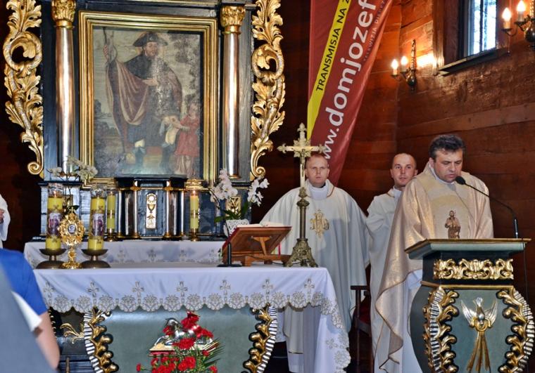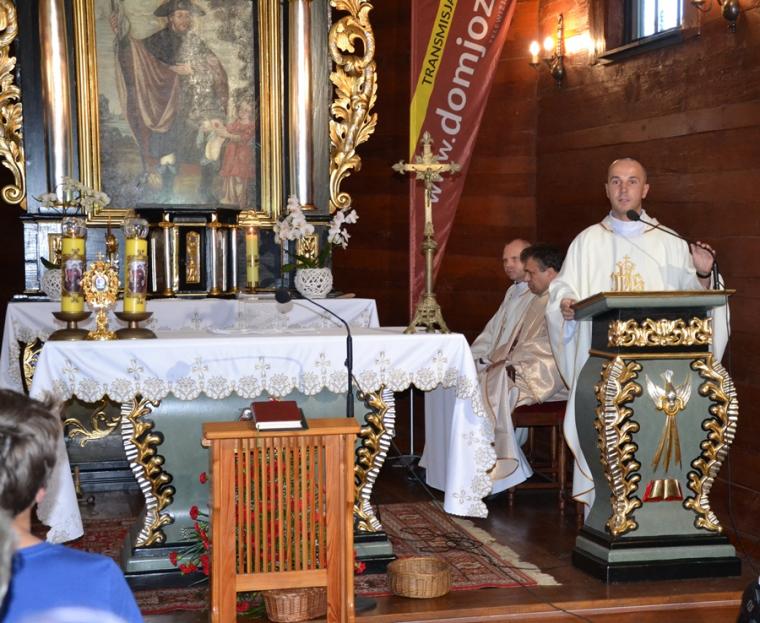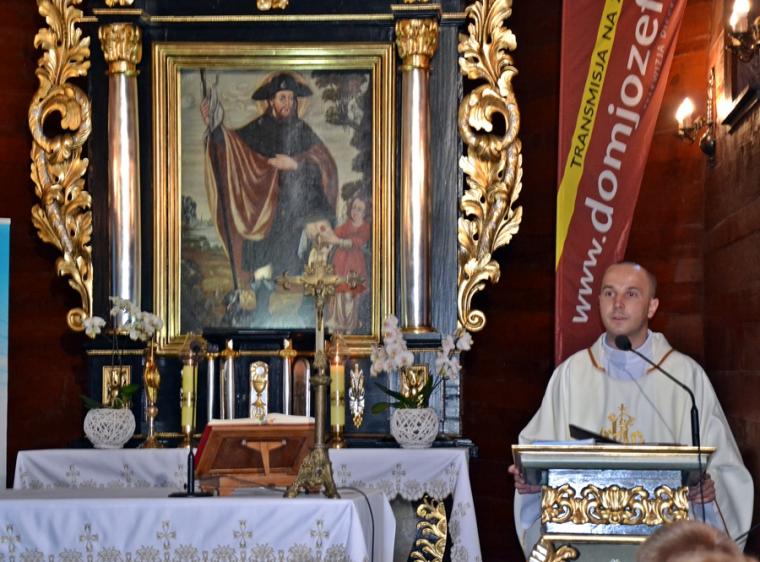 Homilię podczas tej Eucharystii wygłosił ks. Mateusz Puchała. Nawiązując do obchodzonej uroczystości narodzin św. Jana Chrzciciela podkreślił, że z wyjątkiem Najświętszej Maryi Panny jest on jedynym świętym, którego narodziny obchodzone są liturgicznie gdyż są związane z tajemnica wcielenia Syna Bożego. Kaznodzieja zaznaczył, że zostało mu powierzone konkretne zadanie. Co to znaczy być chrześcijaninem? Co to znaczy być świadkiem Jezusa Chrystusa, być światłością dla pogan- to pytania, które warto sobie postawić w kontekście przeżywanej uroczystości. Ks. Mateusz zaznaczył, że Kościół stawia nam w tym dniu postać wielkiego człowieka. Dodał, że nie chodzi jednak byśmy się nim tylko zachwycali, ale naśladowali go w naszym życiu. Wskazał, że powinniśmy uczyć się od św. Jana Chrzciciela jak żyć, postępować, jak służyć Panu Bogu, Kościołowi i bliźnim. W dalszej homilii części kaznodzieja podkreślił, że warto sobie postawić pytanie kim był św. Jan Chrzciciel i jakie było jego życie. Nawiązując do aklamacji zaakcentował, że całe jego życie było poświęcone Panu Bogu, nawoływał do nawrócenia, przygotowywał serca ludzi na przyjście Pana. Prawość i posłuszeństwo słowu Bożemu to kolejne cechy św. Jana Chrzciciela, które wskazał kaznodzieja. Nie bał się upomnieć króla Heroda, który źle postępował, mimo iż wiedział gdzie jest dobro. „Czyż Herod nie jest ikoną, czy obrazem każdego człowieka, który wie dobrze gdzie jest dobro, ale nie ma dość siły i odwagi, aby je w swoim życiu spełnić” – pytał kapłan i dodał „ Słyszymy przecież każdego dnia nauczanie naszych pasterzy. Nasi kapłani nauczają, że należy uczestniczyć we mszy świętej, że nie wolno robić zakupów w niedzielę, nie wolno grzeszyć przeciwko miłości małżeńskiej, miłości rodzinnej, nie wolno kraść, oszukiwać w pracy, w szkole”. Wskazał, że często udajemy, że nas te problemy nie dotyczą, zagłuszamy swoje sumienie, tłumacząc sobie, że jesteśmy wolni. Czego możemy się uczyć od św. Jana Chrzciciela - to kolejne pytanie, które postawił kaznodzieja? Zaznaczył, że jest on przestrogą dla współczesnych ludzi, którym brakuje wierności Chrystusowi. Ubolewał, że wielu ludziom brakuje wierności poglądom, swoje postawy uzależniamy często od sytuacji. Ks. Mateusz podkreślił, że Jezus potrzebuje świadków bezkompromisowych, autentycznych. Ponadto kapłan zwrócił uwagę, że św. Jan Chrzciciel był człowiekiem radykalnym, bezkompromisowo głoszącym Chrystusową prawdę. Kontynuując kaznodzieja zachęcał słuchaczy homilii do postawienia pytania o swoją wiarę, o swoje sumienie. Kim dla Ciebie jest naprawdę Jezus Chrystus to pytanie, na które powinien odpowiedzieć każdy uczestnik modlitewnego spotkania. Kapłan podkreślił, że gdy udzielimy sobie na nie odpowiedź powinniśmy podjąć refleksję nad tym, jak ta deklaracja przekłada się ona na nasze codzienne życie. Ważne jest – podkreślił kaznodzieja- by była to odpowiedź szczera, byśmy odpowiedzieli sobie na pytanie, czy inni patrząc na nasze życie widzą w nas uczniów Jezusa. Świadczenie o Jezusie słowem ale przede wszystkim życiem jest nasza powinnością. Współczesny świat potrzebuje autentycznych świadków Jezusa. Kapłan powiedział: „Jezus pragnie Twojej i mojej wierności. Jezus pragnie Twojej i mojej wierności w tych ,małych, drobnych, prozaicznych rzeczach, ale także w wielkich sprawach, w których również uczestniczymy”. Kontynuując kapłan zachęcał byśmy prosili św. Jana Chrzciciela był dla nas wzorem w codziennym opowiadaniu się za Panem Bogiem. Nasza postawa powinna być mówieniem o Bogu, powinna być zgodą na pełnienie Jego woli.Wierności powołaniu i wypełnianie go do końca możemy uczyć się patrząc na życie św. Jana Chrzcielna. Kaznodzieja wskazał na wielość powołań, którymi Bóg obdarza ludzi i zwrócił uwagę na potrzebę wierności temu powołaniu. Zachęcał, byśmy patrząc na przykład św. Jana Chrzciciela i św. Rocha przyprowadzili jak najwięcej ludzi do Pana Boga i do Kościoła. Powinniśmy być apostołami, którzy przykładem swego życia staną się inspiracją do stawiania sobie przez innych pytania o motywy naszego postępowania. Kończąc kaznodzieja powiedział: „Niech ta dzisiejsza uroczystość narodzenia św. Jana Chrzciciela, niech ta nasza wspólna modlitwa tutaj w Diecezjalnym Sanktuarium Świętego Rocha pomoże nam wzrastać w wierze, pomoże nam umocnić naszą relację z Panem Bogiem abyśmy dzisiaj po wyjściu tej świątyni stali się odważniejszymi, a przede wszystkim autentycznymi świadkami Jezusa Chrystusa. Amen”.