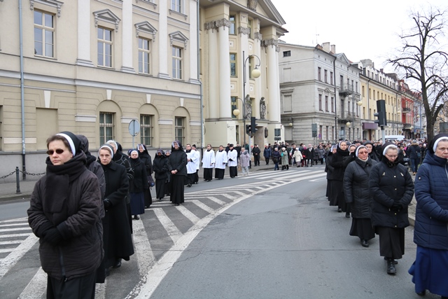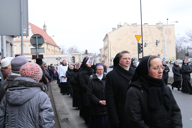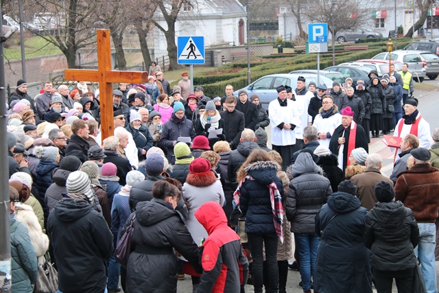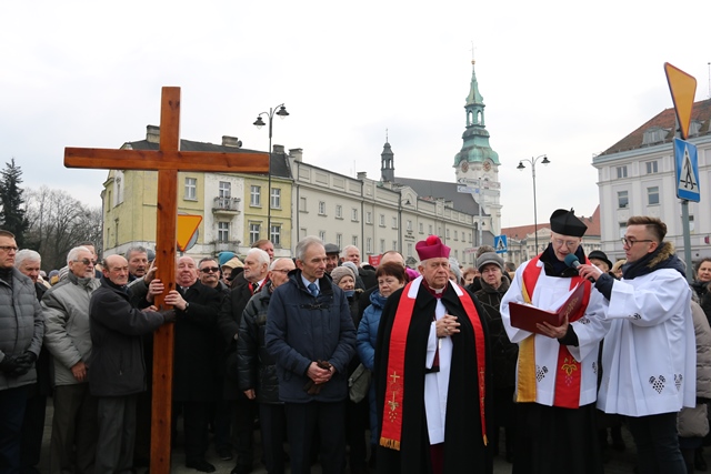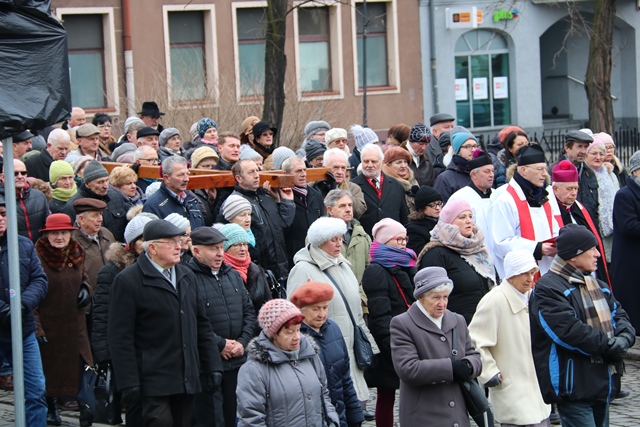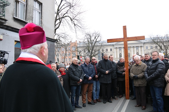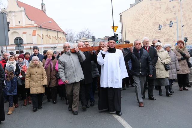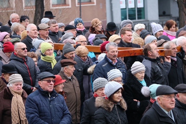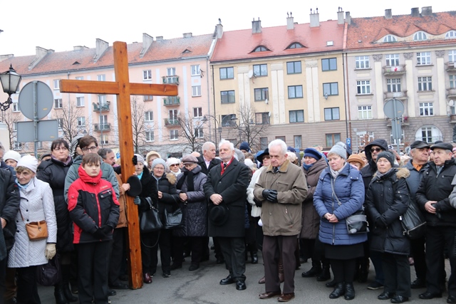 Droga krzyżowa rozpoczęła się przy Grocie Katyńskiej na placu przy Sanktuarium Serca Jezusa Miłosiernego Ojców Jezuitów. Tegoroczne nabożeństwo poświęcono małżonkom i rodzinom. – Papież Franciszek w centrum tego roku stawia nam św. Józefa, Oblubieńca Najświętszej Maryi Panny, którzy razem stworzyli piękne małżeństwo i piękną rodzinę. Rodzina dzisiaj w naszej ojczyźnie i na całym świecie jest zagrożona. Przeżywa kryzysy, często rozpada się. Małżeństwa mają swoją drogę krzyżową. Potrzebna jest modlitwa, dlatego w tej drodze krzyżowej ulicami Kalisza pragniemy objąć małżonków, tych młodych i ze starszym stażem wiekowym – mówił bp Stanisław Napierała rozpoczynając wielkopostne nabożeństwo.