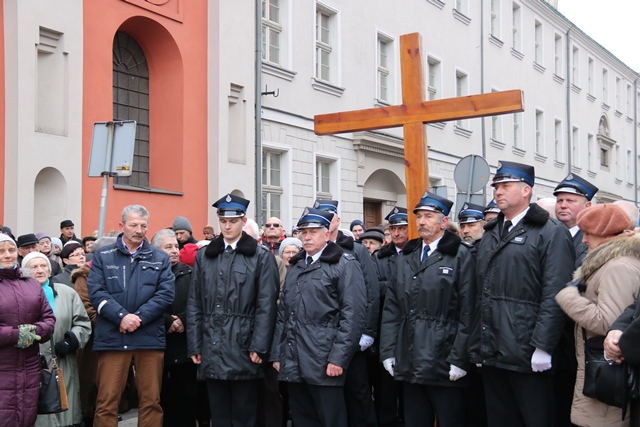 Trzymetrowy drewniany krzyż nieśli wierni kaliskich parafii, podopieczni Schroniska św. Brata Alberta i strażacy.