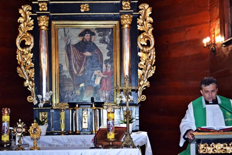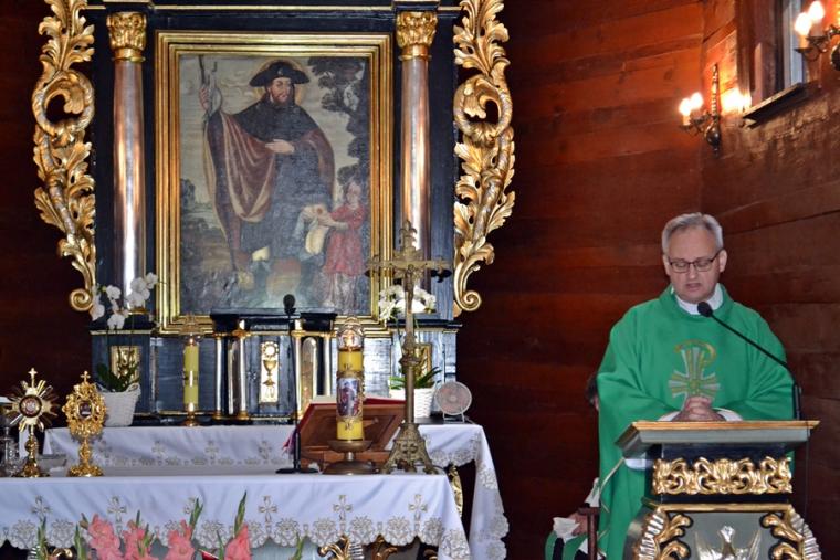 Podczas tej Eucharystii ks. kan. Arkadiusz modlił się w intencji osób chorych, starszych, niepełnosprawnych, którzy byli obecni w sanktuarium, ale także za przebywających w szpitalach, hospicjach, domach opieki. Przepełniona świadectwami z posługi w szpitalu była homilia wygłoszona przez celebransa. Rozpoczynając powiedział, że od roku pracuje jako kapelan. Podkreślił, że kapelan, to ten, który służy. Przyznał, że szpital kojarzy nam się z trudnym doświadczeniem, a „powinien stać się dla nas miejscem, gdzie Bóg jest najbliższy człowieka w tajemnicy ludzkiego cierpienia”. Następnie nawiązał do osoby błogosławionej, która obecna była wśród nas w relikwiach. Jak się okazało chociaż czasy w których żyli św. Roch i bł. Hanna dzieli siedem wieków, to w ich życiorysach znaleźć można wiele wspólnych elementów. Kaznodzieja podkreślił, że obydwoje od najmłodszych lat, byli uczeni wrażliwości na ludzką biedę i cierpienia. Zarówno św. Roch jak i bł. Hanna w młodym wieku tracą najbliższe osoby, oboje posługują chorym, cierpiącym. Kontynuując ks. kapelan przyznał, że bł. Hanna Chrzanowska jest jego szczególną patronką, która od młodzieńczych lat prowadziła go do kapłaństwa. Podkreślił, że poznał, kim ona tak naprawdę była dopiero podczas jej beatyfikacji. Zaakcentował, że ona podobnie jak święty Roch nie miłowała słowem, ale czynem. W dalszej części homilii ks. Arkadiusz przywołał przykład jej heroicznej posługi najbiedniejszym, najbardziej potrzebującym. Zwrócił uwagę, że była ona ta, która wiedziała, że jeśli będzie się z szacunkiem, miłością i delikatnością pielęgnowało ciało człowieka, to z czasem dusza otworzy się na Boga. Dodał, że to ona była tą, która zaprowadziła Jana Pawła II i wielu kapłanów do chorych. Jan Paweł II był dla niej zawsze wsparciem, zawsze mogła na niego liczyć. Ich wspólnym dziełem były pierwsze rekolekcje dla chorych, niepełnosprawnych. Z kolei to chorzy zaprowadzili przyszłą błogosławioną do Chrystusa.