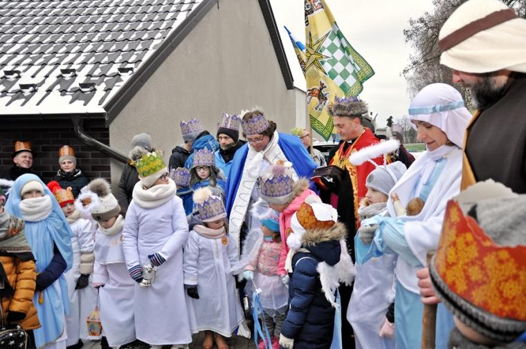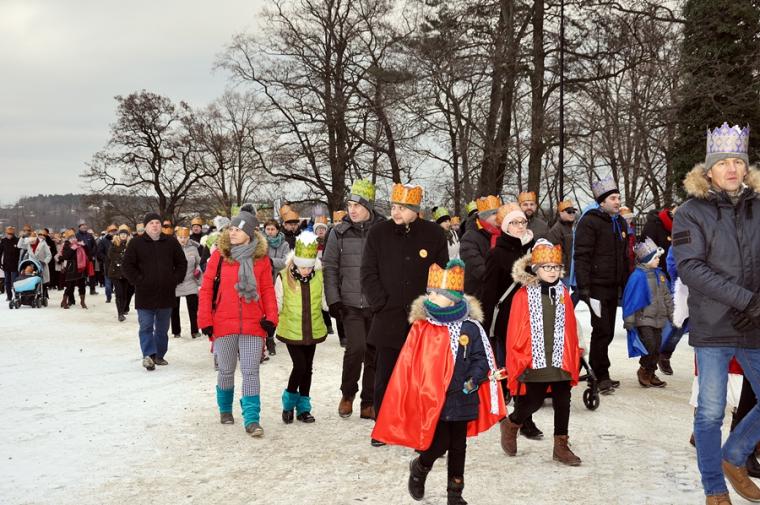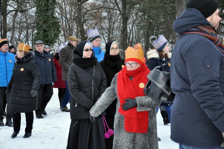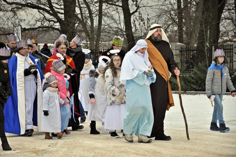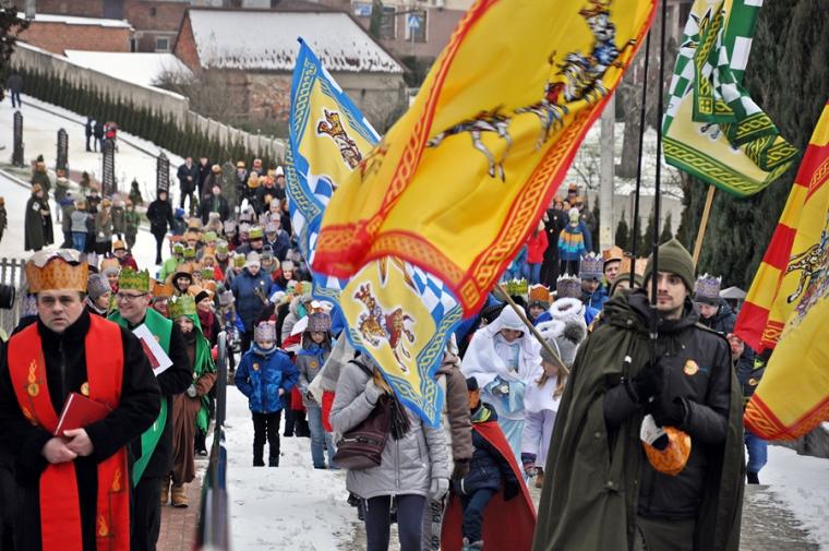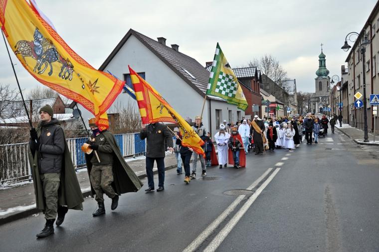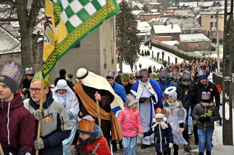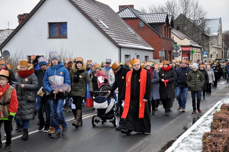 Z Rynku uczestnicy orszaku ulicami miasteczka udali się w kierunki Diecezjalnego Sanktuarium Świętego Rocha. Zatrzymał się na schodach prowadzących do sanktuarium, gdzie ks. kan. Krzysztof odczytał fragment Ewangelii św. Mateusza. Tu zaprezentowana została scenka przedstawiająca pokłon Mędrców ze Wschodu Bożej Dziecinie i złożenie darów. W dalszą drogę Królewski Orszak wyruszył już z Dzieciątkiem Jezus w kierunku parkingu przy sanktuarium. Podczas całej orszakowej drogi śpiewano kolędy. Na parkingu uczestnicy Orszaku obejrzeli jasełka przygotowane przez uczniów szkoły podstawowej z Kaliszkowic Ołobockich.