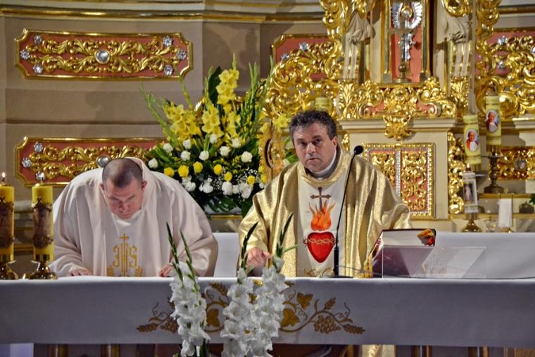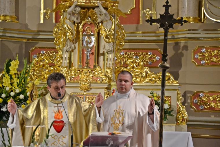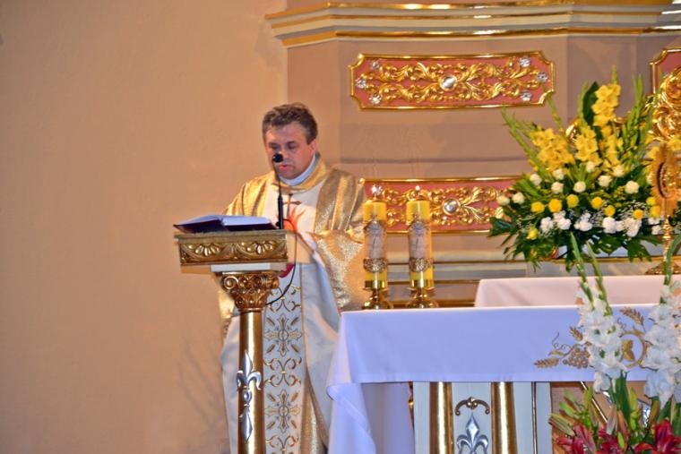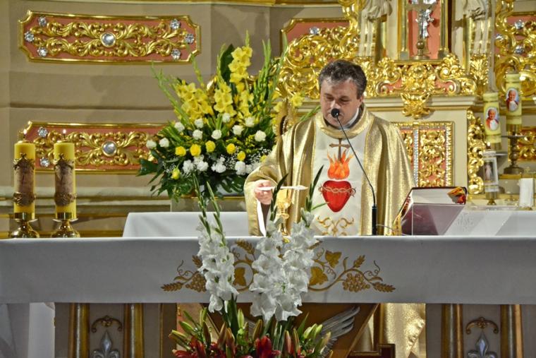 Rozpoczynając homilię ks. kan. Krzysztof podkreślił, że uroczystość Najświętszego Serca Pana Jezusa została ustanowiona na życzenie Pana Jezusa skierowane do św. Małgorzaty Marii Alacoque. Kaznodzieja przypomniał słowa św. Jana Pawła II skierowane do wiernych we Włocławku w 1991 roku: „ Jezu cichy i pokornego serca, uczyń serca nasze według serca Twego. Tak może mówić człowiek do Boga, który stał się Człowiekiem, który jako Człowiek nosi całą pełnie bóstwa i całą niezmierzoną głębie tajemnicy powołania człowieka w Bogu, w tym właśnie ludzkim sercu. Nosi tez w tym ludzkim sercu, na końcu włócznią przebitym włócznią, całą tajemnice ceny, wartości, jaką ma człowiek, całą tajemnicę odkupienia”. Kapłan zachęcał wiernych, by jak najczęściej prosili Jezusa, by uczynił ich serca na wzór Jego boskiego serca i by nie zrywali nigdy przyjaźni z Bogiem. Serca yo najważniejszy nazad ludzkiego ciała-kontynuował celebrans. Bicie serca świadczy o tym, że żyjemy. Podkreślił, że można komuś podarować serce, obdarzyć kogoś miłością. Zaakcentował, że wzorem miłości jest dla człowieka Jezus, gdyż Jego serce zostało przebite na krzyżu za nasze grzechy. Uroczystość Najświętszego Serca Jezusowego jest okazją do dziękczynienia za wielka miłość Boga do człowieka. W dalszej części homilii kaznodzieja wskazał wkład św. Małgorzaty Marii Alacoque w rozwoju kultu Serca Jezusowego. Przypomniał obietnice Jezusa Chrystusa dane za pośrednictwem św. Małgorzaty Marii Alacoque tym, którzy czcić będą Serce Najświętsze: 1.Dam im wszystkie łaski potrzebne w ich stanie. 2.Zgoda i pokój będą panowały w ich rodzinach. 3.Będę ich pocieszał we wszystkich ich utrapieniach. 4.Będę im bezpieczną ucieczką w życiu, a szczególnie przy śmierci. 5.Wyleję obfite błogosławieństwa na wszystkie ich przedsięwzięcia. 6.Grzesznicy znajdą w mym Sercu źródło nieskończonego miłosierdzia. 7.Dusze oziębłe staną się gorliwymi. 8.Dusze gorliwe dojdą szybko do doskonałości. 9.Błogosławić będę domy, w których wizerunek Serca mego będzie czczony. 10.Kapłanom dam dar kruszenia serc najbardziej zatwardziałych. 11.Osoby, które będą to nabożeństwo rozszerzały, będą miały imię swoje zapisane w mym Sercu i na zawsze w nim pozostaną. 12.Przyrzekam w nadmiarze miłosierdzia Serca mojego, że wszechmocna miłość moja, udzieli tym wszystkim, którzy przyjmą komunię św. w pierwsze piątki przez dziewięć miesięcy z rzędu, łaskę pokuty, iż nie umrą w niełasce mojej ani bez sakramentów świętych, a Serce moje będzie im pewną ucieczką w ostatniej godzinie ich życia. Jest ich tak wiele, korzystajmy więc z bezmiaru miłości Serca Jezusowego. Czcijmy Serce Jezusowe zachęcał celebrans. Kontynuując rozważanie ks. kan. Krzysztof zaznaczył, że powinniśmy w troszczyć się o to, by nasze serca były ciche i pokorne. Jednocześnie podkreślił, że pycha stanowi poważne zagrożenie dla naszego życia duchowego, gdyż rodzi się w naszym sercu i umyśle, popycha nas do złych działań, pragnień. Celebrans apelował, byśmy często przychodzili do Jezusa, zwłaszcza gdy jest nam trudno, bo w Jego sercu znajdziemy ukojenie dla naszych dusz. Od Jezusa mamy się uczyć pokory i miłości do Boga Ojca i do człowieka- zachęcał parafian ks. proboszcz.