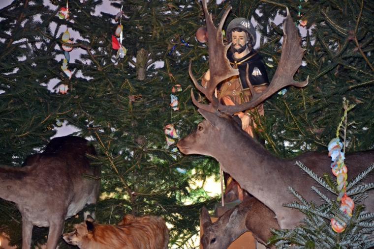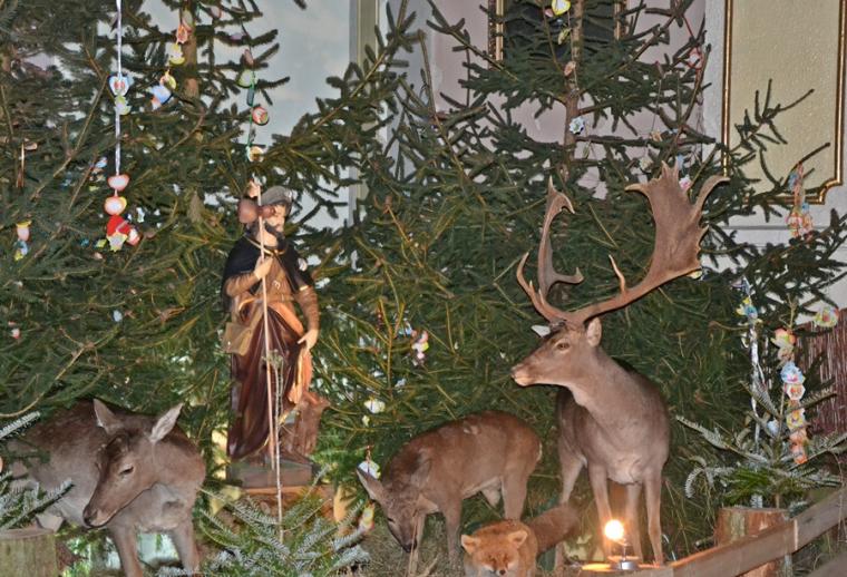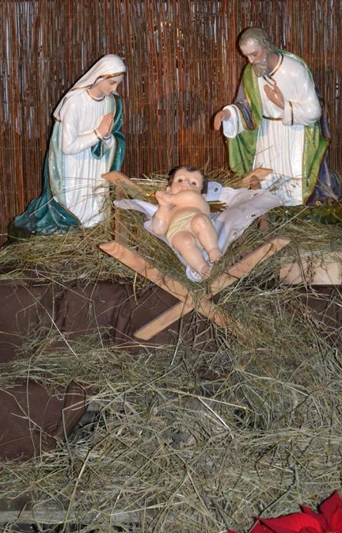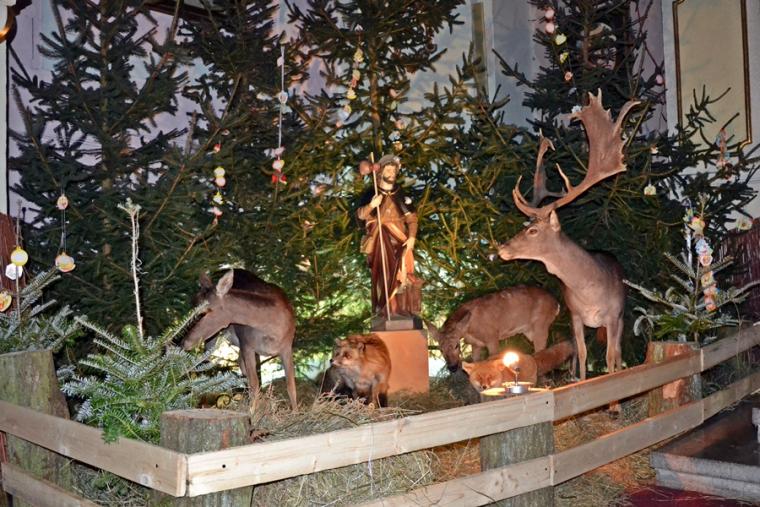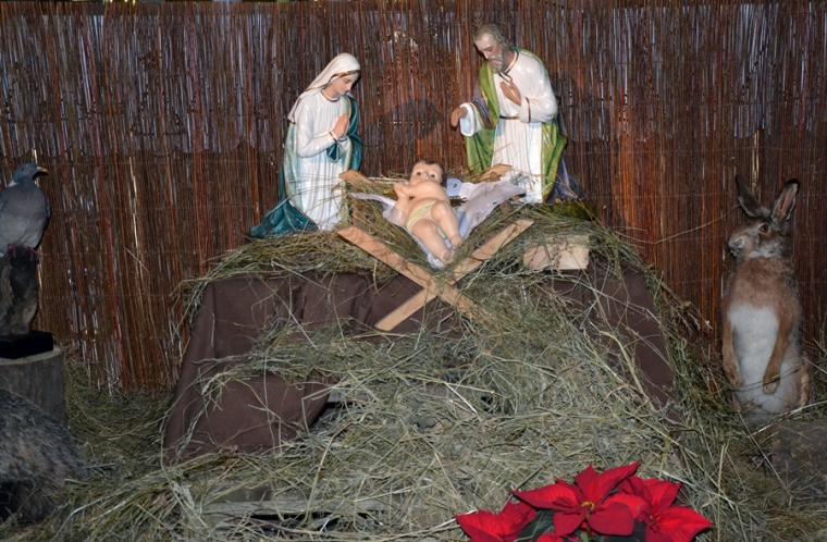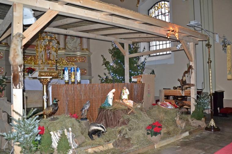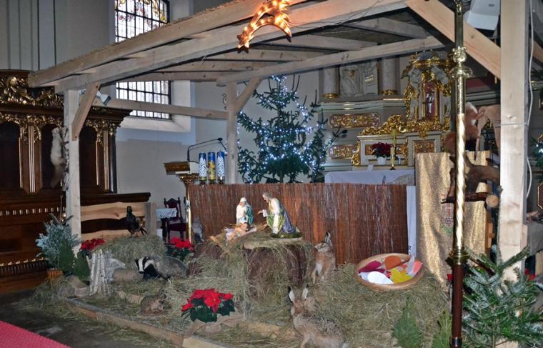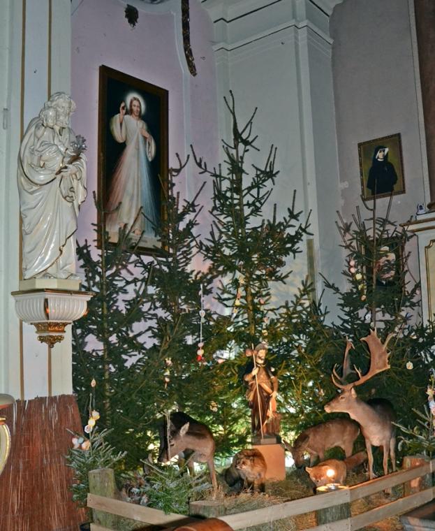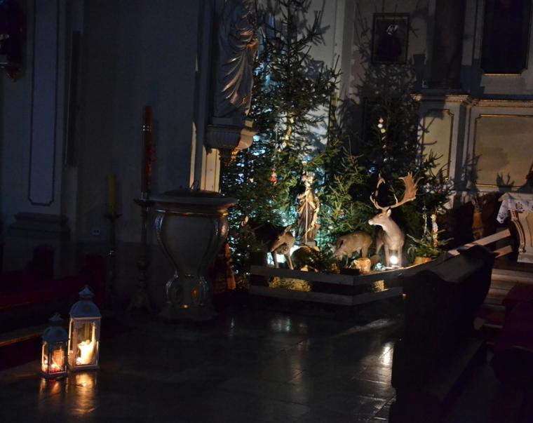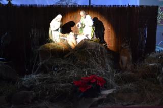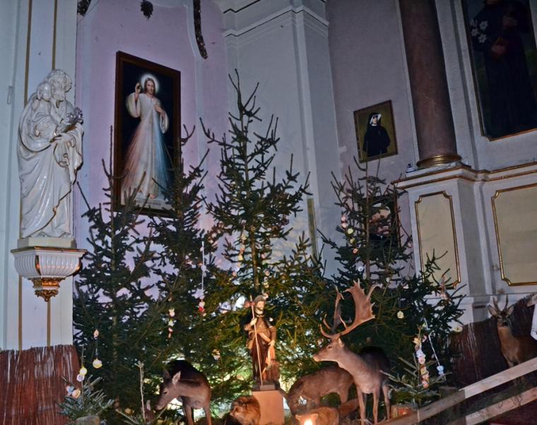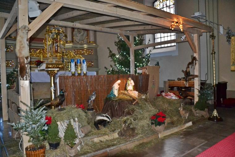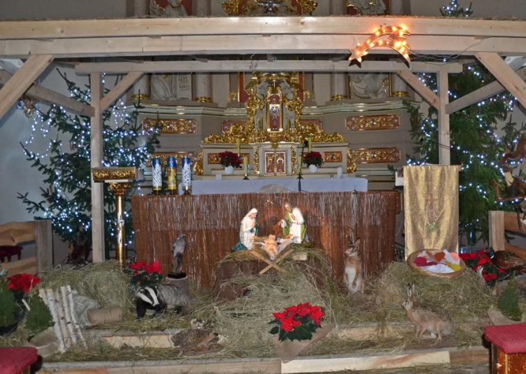 W tym roku jest jednak nieco inna niż w ubiegłych latach.  Składa się z dwóch części. Na pierwszą składa się szopa, którą  obudowany został ołtarz. Tu na sianie otoczone troskliwym spojrzenie Maryi i Józefa leży  Dzieciątko Jezusa. Zostało uroczyście wniesione i złożone w żłóbku podczas pasterki przez ks. proboszcza. Nad szopą  świeci gwiazda betlejemska, ta która kiedyś przyprowadziła pastuszków i mędrców do narodzonego Zbawiciela, którzy uwierzyli, że to Dziecię urodzone w ubogich warunkach jest Bogiem. Światło betlejemskiej gwiazdy ma także prowadzić tych, którzy nawiedzają mikstacką świątynię w miejsce w niej najważniejsze. Są w koszyczku serduszka wykonane przez dzieci z zapisanymi dobrymi uczynkami. To dar dziecięcych serc dla Jezusa. Nowym elementem wykorzystanym w aranżacji wystroju żłóbka są dermoplasty zwierząt leśnych, które zostały wypożyczone z Ośrodka Kultury Leśnej w Gołuchowie. Zobaczyć tu możemy m.in. zająca, borsuk, gołębia, kunę, wiewiórkę. Od kilku lat nieopodal Maryi stała figurka św. Rocha, który jest patronem nie tylko diecezjalnego sanktuarium, ale także miasta Mikstat. Jest także co warto przypomnieć patronem chroniącym przed morowym powietrzem, epidemiami, chorobami zaraźliwymi. To właśnie dla św. Rocha znalazło się miejsce w drugiej części żłóbka. Tę drugą część stanowi lasek utworzony z choinek, w którym ustawione zostały kolejne dermoplasty zwierząt leśnych. Są tu sarny, jelenie, daniele, lis. Na skraju lasu stoi figura św. Rocha. To jego wstawiennictwo przyzywa się szczególnie często w różnych rejonach świata, prosząc przez jego wstawiennictwo Boga o ustanie epidemii koronawirusa. Święty Roch otrzymał od Pana Boga obietnicę, że każdy kto z wiarą w czasie panowania chorób zaraźliwych będzie wzywał jego wstawiennictwa, jeśli taka będzie wola Boża zostanie uzdrowiony. Nie przypadkowo św. Roch stoi na skraju lasu. Takie jego usytuowanie związane jest z wydarzeniem z jego życia. Święty Roch posługiwał z wielkim oddaniem osobom zarażonym. Otrzymał od Boga dar uzdrawiania za pomocą znaku krzyża wykonywanego nad zarażonym. Wiele osób uzdrowił - jak wskazują hagiografowie. Osłabiony heroiczna posługą bliźnim sam uległ zarażeniu i nie chcąc być ciężarem dla innych udał się właśnie do pobliskiego lasu, by tam zakończyć życie. Inna była jednak wola Boga względem niego. Bóg zatroszczył się o swego wiernego sługę i pies przynosił mu chleb. Stąd na obrazach i figurach przy nodze św. Rocha widzimy psa, który trzyma w pyszczku chleb.