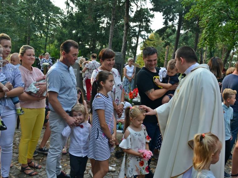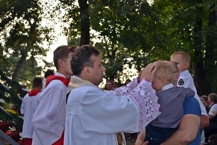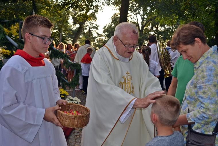 Piękne duchowo były te przedodpustowe i odpustowe dni u Świętego Rocha w Mikstacie. Wypełniła je modlitwa, wsłuchiwanie się w słowo Boże, pochylanie się nad błogosławieństwami wygłoszonymi przez Jezusa na Górze. My także wsłuchiwaliśmy się w nie na Górze, w miejscu które w sposób szczególny czczony jest św. Roch. To przez jego wstawiennictwo zanosiliśmy do Boga dziesiątki próśb i podziękowań, bo wierzymy i wielokrotnie doświadczyliśmy tego, że jest on patronem codziennych trudnych spraw. Potem całonocne czuwanie modlitewne przy Jezusie ukrytym w Najświętszym Sakramencie i relikwiach św. Rocha. Rankiem wraz ze wschodem słońca w sanktuarium wybrzmiały Godzinki o św. Rochu Wyznawcy. Bogaty był program uroczystości odpustowych. Rozpoczęły się spotkaniem modlitewnym osób chorych i starszych przy relikwiach bł. Hanny Chrzanowskiej i św. Rocha. Warto zauważyć jeszcze jedną grupę, która w czwartkowe popołudnie już po błogosławieństwie zwierząt i odpustowej sumie przybyła na swoje spotkanie z Jezusem i św. Rochem. To rodzice wraz z dziećmi. Znane nam są słowa Jezusa: „Pozwólcie dzieciom przychodzić do mnie, nie zabraniajcie im” . Nie tylko nie zabraniali, ale przyprowadzili swoje dzieci do Jezusa i naszego niebieskiego patrona św. Rocha rodzice, którzy przybyli na godz. 18:00 na Eucharystię sprawowaną  przez ks. Marcina Walczaka w ich  intencji. Wraz z ks. Marcinem przy ołtarzu stanął ks. kan. Jerzy Rasiak. W słowie skierowanym do zebranych  ks. Marcin nawiązując do słów Ewangelii podkreślił, że gdyby  do nas należało osądzanie ludzkich grzechów i przewinień  bylibyśmy  podobni do tego sługi, który miał niewyobrażalnie wielki dług. Jest on człowiekiem który z jednej strony prosi o przebaczenie, z drugiej sam nie potrafi wybaczyć. Zaakcentował, że często zachowujemy się podobnie, gdy ktoś zawini wobec nas przechowujemy, w pamięci wypominamy takiej osobie przez długie lata, a nawet przez całe życie. Sytuacje takie dotyczą często osób sobie najbliższych. Celebrans podkreślił, że Jezus zachęca nas do innej postawy, taką jaką  my znamy. Gdy zawinimy wobec kogoś chcemy, by przyjął nasze przeprosiny od razu. Zwrócił uwagę, że jeśli dzieci przepraszają rodziców, to są szczere, natomiast dorośli mają często problem  z tym, by kogoś przeprosić. Zwrócił uwagę na konieczność przebaczenia nie tylko ustami, ale przede wszystkim  sercem. Kończąc ks. Marcin powiedział: „ Niech dzisiejsza Ewangelia prowadzi nas w naszym życiu. Amen”. Po mszy świętej ks. kan. Jerzy Rasiak, ks. kustosz Krzysztof Ordziniak i ks. Marcin udzielali indywidualnego błogosławieństwa dzieciom. Piękny był ten czas spotkania dzieci z Jezusem i św. Rochem i ważnym… Dlaczego? To modlitewne spotkanie zamknęło koło przekazu międzypokoleniowego wiary i tradycji. Rozpoczęły odpustowe obchody osoby starsze, te które przekazują młodym wiarę i piękne zwyczaje odpustowe, zakończyli najmłodsi. Mamy nadzieję, że  za kilkanaście lat i oni przyprowadzą tutaj swoje dzieci. Uroczystości odpustowe zbliżały się do końca. Po mszy świętej procesja z Najświętszym Sakramentem i relikwiami św. Rocha wyruszyła z  powrotem do fary.