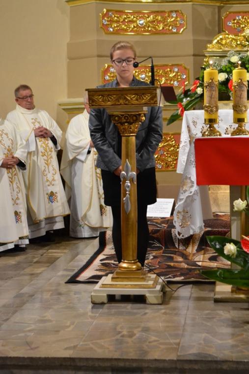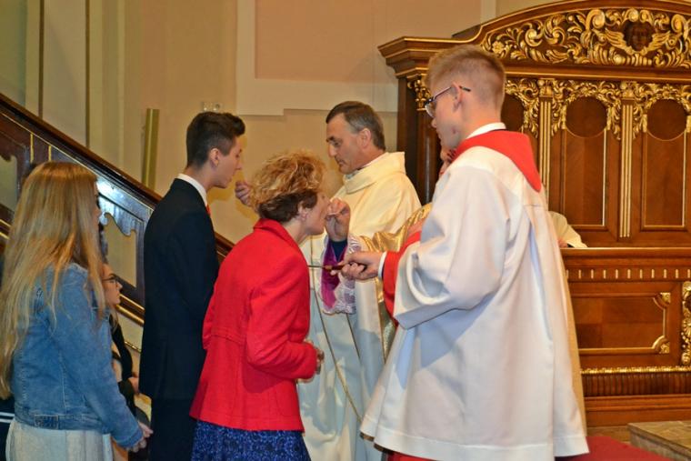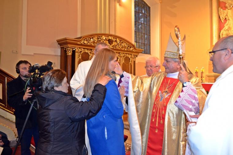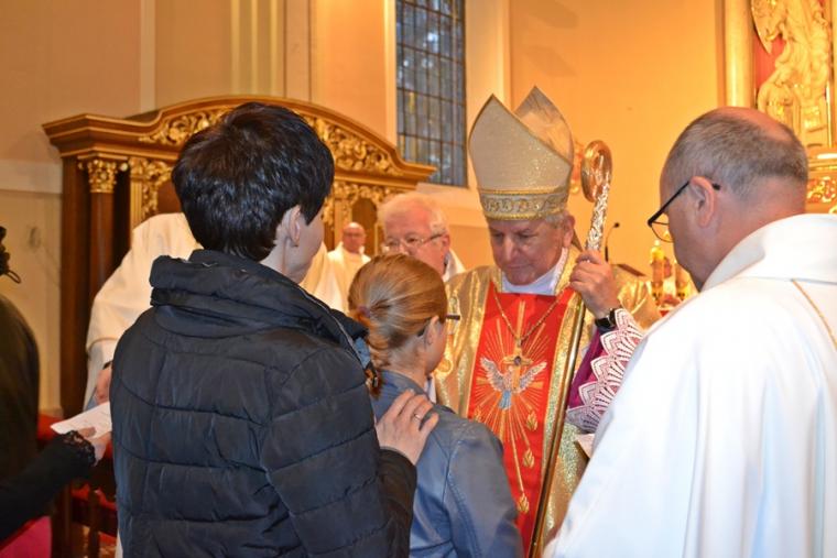 Następnie Ks. Bp wraz z kapłanami w geście wyciągniętych rąk modlił  się o dary Ducha Świętego dla przyjmujących Sakrament Bierzmowania. Po zakończonej modlitwie miało miejsce namaszczenie czoła olejem Krzyżma Świętego, któremu towarzyszą słowa formuły sakramentalnej: „Przyjmij znamię daru Ducha Świętego”. Nie zabrakło oczywiście podziękowań młodzieży skierowanych do ks. bpa Ordynariusza za udzielenie im sakramentu bierzmowania mającego umocnić ich na do mężnego wyznawania wiary. Były też słowa podziękowania dla kapłanów i rodziców.