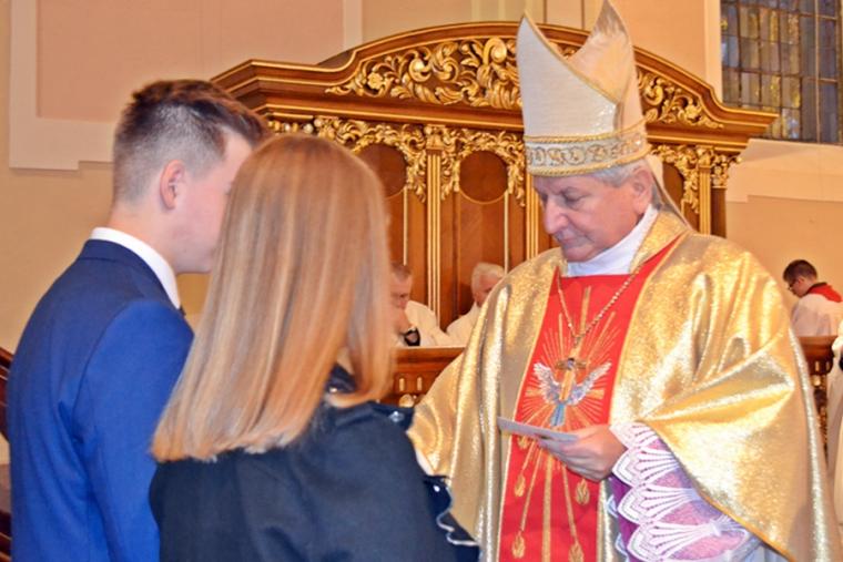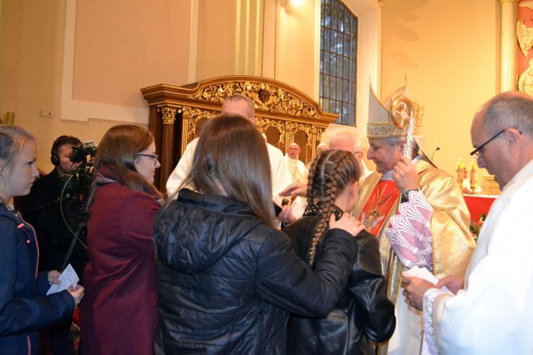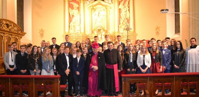 Druga część homilii skierowana była przede wszystkim do kandydatów do bierzmowania. Podkreślił, że sam moment bierzmowania trwa, krótko, jednak pozostawia trwały ślad w duszy człowieka. Celebrans dodał: „Choć ten sakrament przyjmuje się raz w życiu, On Duch Święty was już nigdy nie opuści. Głosem waszego sumienia będzie wam podpowiadał co należy czynić, jak należy postępować, ale Pan Bóg  nie zniewala człowieka. Jeżeli ktoś chce ma wolną wolę do tego stopnia jest człowiek wolny, że może odwrócić się od Pana Boga, pogardzić Bogiem”. Nawiązując do słów Ewangelii Biskup Ordynariusz przekonywał  młodych, że jeśli przyznają się do Jezusa, Ten nigdy ich nie opuści. Pan Bóg potrzebuje ludzi. Jesteście potrzebni Kościołowi przekonywał młodych hierarcha,  podkreślając, że świat potrzebuje świadków wiary. Podkreślił, że takimi świadkami był bł. ks. Jerzy Popiełuszko, ale i patron dnia św. Jan Kanty. Kontynuując ks. biskup podkreślił, że jest wiele dróg prowadzących do Boga. Zaznaczył jednak, że aby życie człowieka wydało dobre owoce potrzebni są świadkowie wiary , ale także jedność oddziaływań Kościoła, rodziny i szkoły. Sakramenty, objawienie przekazana na kartach Pisma Świętego to jak wskazywał celebrans pewna droga do Boga, dodając jednocześnie,  „ale jest jeszcze trzecia droga sprawdzona, która prowadzi do Boga, to jest drugi człowiek”. Wskazywał młodym, że należy tak iść przez  życie, żeby nikt przeze mnie nie płakał, żeby być otwartym, pomocnym, bez względu na światopogląd, różnice, język, bo każdy człowiek stworzony jest na obraz i podobieństwo Boże. I chciałbym, żebyście może inne rzeczy zapomnicie z tej uroczystości, ale tego nie zapominajcie, że nie ma przypadkowych spotkań, że każdy człowiek jest dla mnie wezwaniem”. Następnie ks. biskup zaapelował do rodziców, by byli świadkami wiary dla swoich dzieci. Podkreślił znaczenie dziadków w formowaniu religijności wnuków. Kończąc celebrans podziękował wszystkim, którzy w   jakikolwiek sposób przyczynili się do zorganizowania tak  pięknej uroczystości.