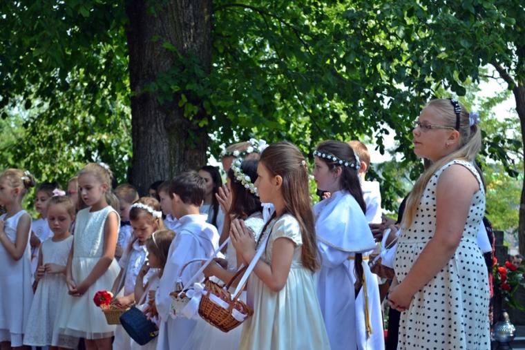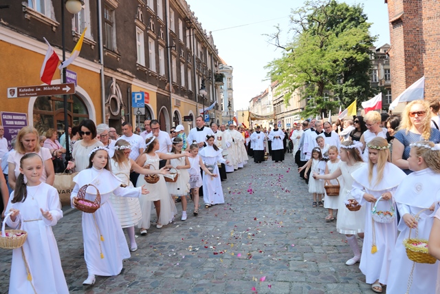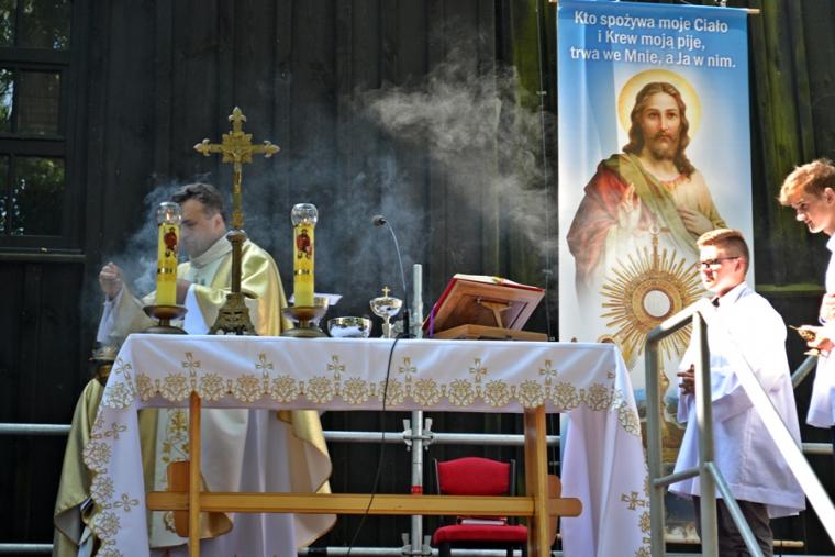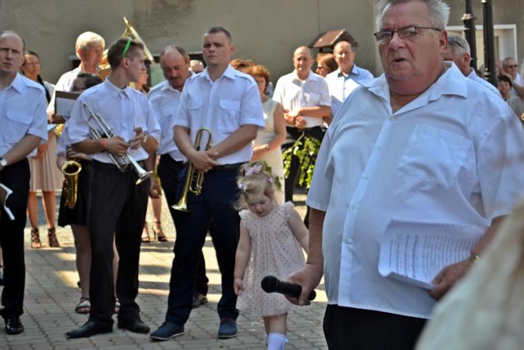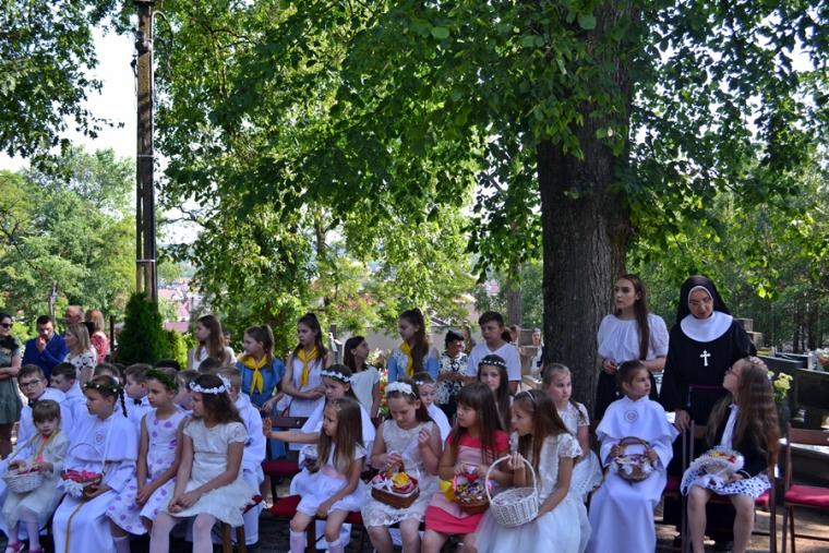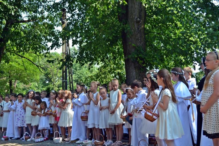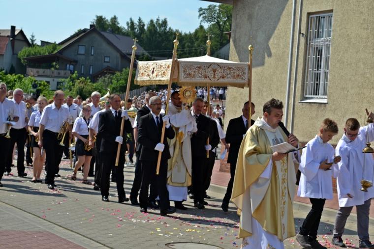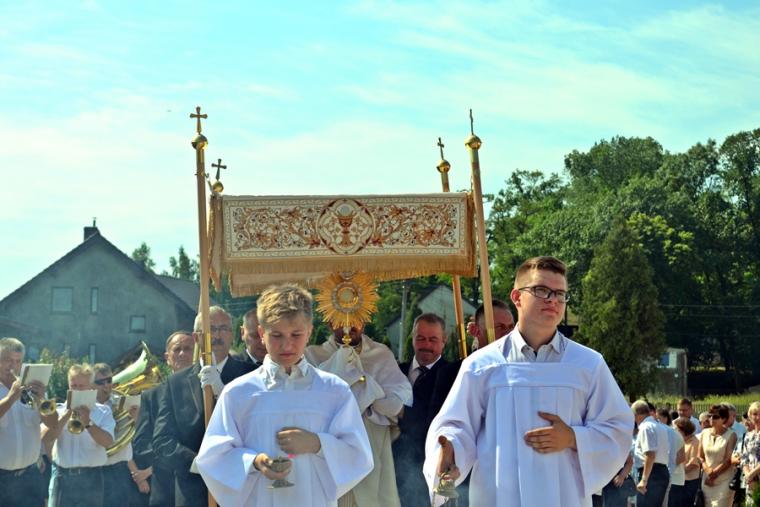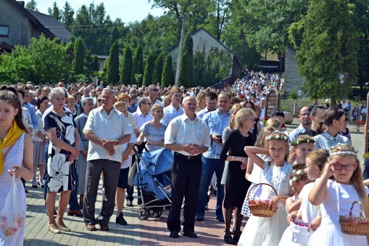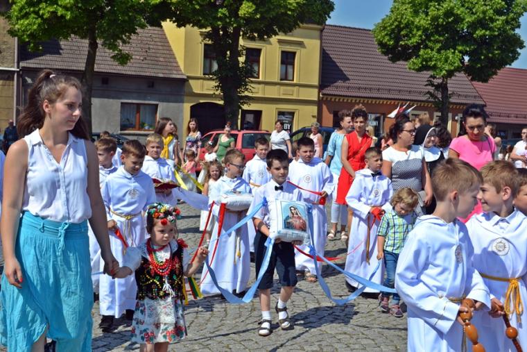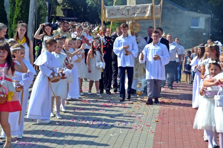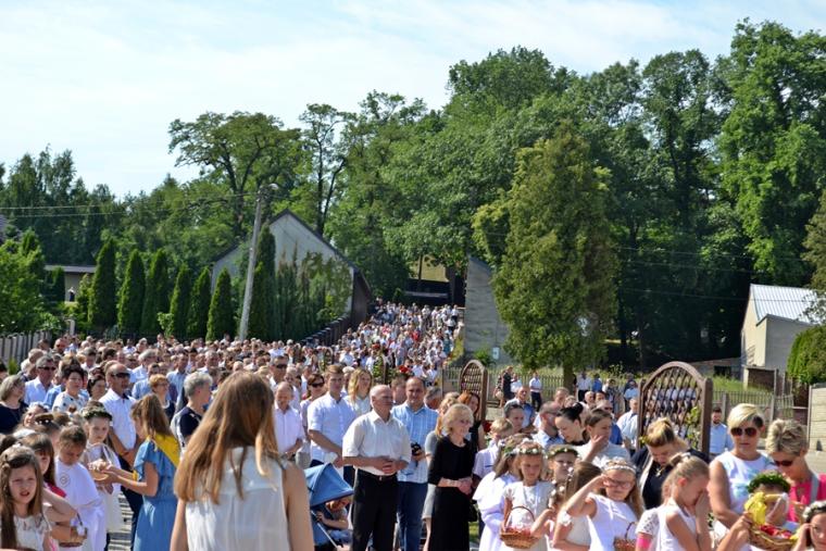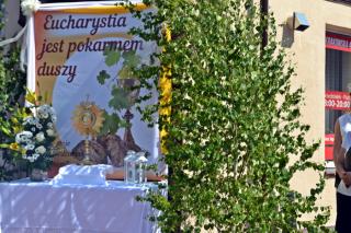 Wracając do głównego wątku rozważania kaznodzieja zachęcał wiernych do postawienia sobie pytania: „Co Jezus ukryty pod postacią Chleba, zobaczy w czasie wędrowania przez nasze miasto i parafię? Jaką zobaczy Ojczyznę, jaki Kościół, jaką rodzinę, jakiego człowieka?”. W dalszej części homilii celebrans podkreślił, że uroczystość Bożego Ciała jest wielkim pokłonem złożonym Jezusowi, ale jednocześnie zachęcał, by odpowiedzieć sobie na pytanie, czy zawsze oddajemy Bogu pokłon. Zaznaczył, że różnie z tym bywa. Myślą przewodnią rozważania były słowa pieśni „ Zróbcie Mu miejsce…”. Kończąc rozważanie ks. kanonik powiedział: „ Mam do Was ogromną prośbę w tym roku, abyśmy zrobili Bogu miejsce w naszych kalendarzach, które są tak mocno zapełnione różnymi sprawami”. Parafia podzielona jest na rejony, jak podkreślił ks. proboszcz nie tylko po to, by wywiązywały się one m.in. z organizacji procesji w poszczególnych dniach, ale i po to, by ich mieszkańcy w tych dniach uczestniczyli w Eucharystii. Jak odpowiemy na to zaproszenie? Czy zrobimy miejsce dla Pana w naszych sercach i w naszych kalendarzach. Tak wielu z nas przyjęło Jezusa w Komunii Świętej. Zrobiliśmy Mu miejsce w naszych sercach. Po Mszy Świętej odbyło się wystawienie Najświętszego Sakramentu, następnie wraz z Jezusem ukrytym pod postacią Chleba wyruszyliśmy w procesji do czterech ołtarzy. Przedstawiciele poszczególnych regionów przygotowali ołtarze. Trasa tegorocznej procesji wiodła od Diecezjalnego Sanktuarium Świętego Rocha do krzyża misyjnego przy naszej farze, której 100- lecie konsekracji przeżywać będziemy w październiku. Jak to już staje się tradycją w naszej wspólnocie co roku procesja odbywa się inna trasą, bo Jezus przychodzi do wszystkich. Przy poszczególnych ołtarzach wsłuchiwaliśmy się w rozważania, których myślą przewodnia była EUCHARYSTIA. Na pierwszym ołtarzu znajdowało się hasło: Eucharystia jest Ofiarą. W słowach rozważania usłyszeliśmy m.in. „ W opisie Eucharystii bardzo ważne są cztery czasowniki: brać, błogosławić, łamać, dawać. Dzięki nim możemy zaobserwować, na czym polega logika ofiary Jezusa”. O tym jak wielka jest tajemnica Boga i o Eucharystii jako pokarmie dla duszy mowa była w rozważaniu przy drugim ołtarzu. Na trzecim ołtarzu widniało hasło: „Eucharystia jest sakramentem zjednoczenia”. Tu do wiernych popłynęło przesłanie: „ Ten, który pokonał śmierć może wejść pomimo drzwi zamkniętych, pomimo zakrytych bielmem oczu i zatwardziałych serc. Wówczas, gdy On wychodzi nam naprzeciw , ukazuje się jako żyjący, dający życie”. Hasło na trzecim ołtarzu zachęcało nas do spojrzenia na Eucharystię jako zadatek nieśmiertelności. Tu wybrzmiało także Te Deum laudamus. Procesję zakończyło błogosławieństwo Najświętszym Sakramentem na cztery strony świata. Podczas procesji niesione były sztandary i feretrony. Uroczystość uświetniła orkiestr parafialna i chór. A tuż przed baldachimem kroczyły dziewczęta sypiące kwiatki. Było ich podczas tegorocznej procesji bardzo dużo. Jezus ukryty pod postacią Chleba przemierzał ulice naszego miasteczka obsypywany płatkami kwiatków.