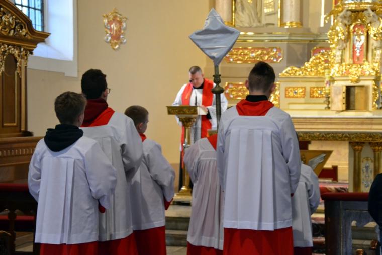 Liturgii Wielkopiątkowej przewodniczył ks. kan. Krzysztof Ordziniak. Niezwykła cisza i modlitewna zaduma zapanowała w kościele, gdy kapłan w tzw. geście właściwym Wielkiego Piątku leżał krzyżem przed ołtarzem. Podczas liturgii wielkopiątkowej odczytany został opis Męki i Śmierci Pana Jezusa. Podczas liturgii wielkopiątkowej kilka słów refleksji na temat krzyża w życiu człowieka  skierował do licznie zebranych w świątyni wiernych ks. kan. Krzysztof.  Kapłan  zaakcentował, że Wielki Piątek jest dniem krzyża. Wskazał, że Kościół zatrzymuje się, aby ukazać ludziom cenę, za jaka Chrystus nas zbawił. Dodał jednak, że milczenie Wielkiego Piątku nie jest milczeniem rozpaczy, ale zadumy i refleksji nad miłością, która jest  zdolna do największej ofiary. Kaznodzieja zachęcał zebranych do modlitwy i postawienia sobie pytania, czy potrafimy przyjąć krzyż. Krzyż,  jak podkreślał, stoi w centrum Liturgii. Zwrócił uwagę na obnażony ołtarz, na którym brakuje obrusów, świeczników, kwiatów. Był natomiast pewien bardzo ważny gest. Powiedział: „celebrans(…) padł na twarz. To przejmujący znak modlitwy księdza leżącego na posadzce kościoła- jak podczas święceń kapłańskich. Trochę tak, jakby liturgia chciała nam przypomnieć, że bycie księdzem, bycie chrześcijaninem, jest powiązane z wejściem w tajemnicę Krzyża”. W  dalszej części rozważania kapłan przywołał obraz znajdujący się w starym klasztorze. Przedstawia on Jezusa niosącego wielki krzyż, a wokół Niego wielu ludzi z małymi krzyżykami w ręku. Kapłan wskazał, że każdy człowiek ma swój krzyż. Podkreślił, że autor tego obrazu chciał ludziom przypomnieć słowa Chrystusa: „ Jeśli kto chce pójść za Mną, niech się zaprze samego siebie, niech weźmie krzyż swój i niech Mnie naśladuje”. Kontynuując, ks. proboszcz Krzysztof podkreślał potrzebę podjęcia swego krzyża i podążania z nim za Chrystusem. Wskazał na wielorakość i różnorodność krzyży, które trzeba przyjąć w swoim  życie. Jest ich tak wiele, jak wielu jest ludzi. Zwrócił uwagę na krzyż samotności, zdrady, odrzucenia, choroby, nieszczęśliwych wypadków, śmierci bliskich. Kontynuując powiedział: „Krzyż ma wiele imion. Jedno jest pewne: trzeba podjąć swój krzyż, aby upodobnić się do Chrystusa. Kto nie bierze swego krzyża, nie jest Mnie godzien  - mówi Jezus”. Kapłan zwrócił uwagę wiernych, że aby zrozumieć  i podjąć swój krzyż, trzeba zrozumieć krzyż Chrystusa. To z niego mamy czerpać siłę i moc. W końcowej części rozważania kapłan przywołał postać Karola Antoniewicza, autora pieśni: „ W krzyżu cierpienie, w krzyżu zbawienie…”. Wskazał trudne koleje jego życia: śmierć dzieci, żony. Jego żona w czasie choroby mówiła do niego: „Karolu, trzeba głośno dziękować, a cicho cierpieć”. Po jej śmierci wstępuje do jezuitów.  Ma dar przemawiania do cierpiących. W czasie epidemii z wielkim oddanie posługuje chorym. Sam się zaraża i tuż przed śmiercią pisze pieśń „ W krzyżu cierpienie, w krzyżu zbawienie, w krzyżu miłości nauka…”