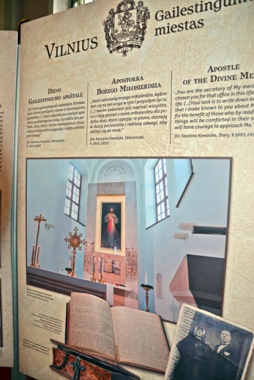 Ponadto w lipcu organizowana jest z parafii pielgrzymka do Wilna. Wystawa ma więc zachęcić do wyruszenia na pielgrzymi szlak, a tym którym nie będzie to dane przybliżyć miejsca związane z kultem Bożego miłosierdzia. Jest ich jak możemy się przekonać oglądając wystawę bardzo wiele. Pomysłodawcą wystawy jest ks. Mariusz Marszałek, były sekretarz ks. Abp Wilna Gintarasa Grusasa. Po raz pierwszy została zaprezentowana w Senacie w 2016 roku. Autorem zdjęć jest artysta i fotograf Marian Dzwinel. Wystawa składa się z 16 plansz, na których umieszczone są zdjęcia i teksty w trzech językach polskim, litewskim, i angielskim. Oto niektóre tytuły prezentowanych na wystawie plansz: Apostołka Bożego Miłosierdzia, Święta Faustyna  w Wilnie, Matka Miłosierdzia, Nadzieja, Dzieła Miłosierdzia, Na drogach Bożej Opatrzności, Obraz Jezusa Miłosiernego, Nowe zgromadzenia, Krzyż wyrazem Bożego miłosierdzia  i kilka innych. Na jeszcze jedną chcemy zwrócić uwagę – Nowa iskra, a na niej Sanktuarium Miłosierdzia Bożego i tekst  Aktu zawierzenia losu świata Miłosierdziu Bożemu przez św. Jana Pawła II. Dodajmy, że każda plansza zawiera opis miejsca, bądź fragment z Dzienniczka św. S. Faustyny, czy pamiętnika, listów bł. Michała Sopoćko.