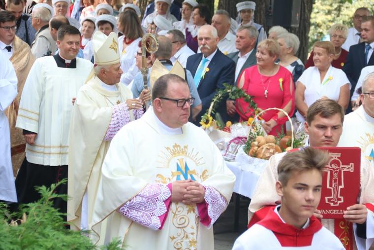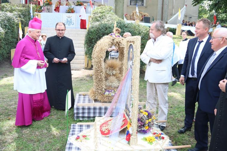 Po Eucharystii starostowie dożynek: Monika i Karol Grzeszczyk z Rudy w gminie Zduny oraz starostowie pomocniczy Agnieszka Kaj i Jan Jaskuła z Lutogniewa oraz Małgorzata Ziętek z Fijałowa i Bronisław Koncewicz z Długołęki w gminie Kobylin złożyli bochen chleba na ręce biskupa kaliskiego Edwarda Janiaka, kustosza Sanktuarium Matki Bożej Pocieszenia w Lutogniewie ks. kan. Łukasza Żurawskiego i starosty krotoszyńskiego Stanisława Szczotki. W swoim wystąpieniu biskup kaliski prosił, aby młode pokolenia uczyć miłości do ziemi: „Dzisiaj trzeba mówić dzieciom i wnukom o przodkach. Trzeba uczyć miłości do ojczyzny. Dzisiaj, kiedy jesteśmy w Europie i napływają do nas te wszystkie trendy, również negatywne to bardzo ważne jest, aby pielęgnować wiarę, uczyć modlitwy. W tej wielkiej Europie jesteśmy taką gwiazdą nadziei tradycji, świętości, miłości do Kościoła i ojczyzny.”.